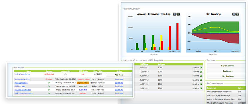 Dynamic Dashboards for Lenders and BorrowersBusiness Health Overview pages provides a summary of the recent BBCs along with trending charts for Accounts Receivable and BBC health. Lenders use their dashboard to prioritize their daily work activities: items that need to be addressed float to the top such as overdue BBCs and borrowers who have not yet activated their account. Enjoy more information at your fingertips with an at-a-glance summary of each borrower's line penetration and BBC status. Lenders can even maintain relationships by sending messages to borrowers right from your dashboard. |