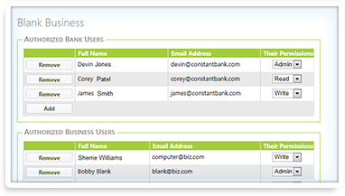 Control access with advanced user-management Various levels of access can be configured based upon roles and responsibilities befitting their role. This flexibility allows lenders to provide access to analysts or partners to review previously private portfolios. Likewise, businesses can enable third-party access rights for outsourced accountants or CFOs. Access can be granted in read, write, or admin levels depending upon the needs of the users. |